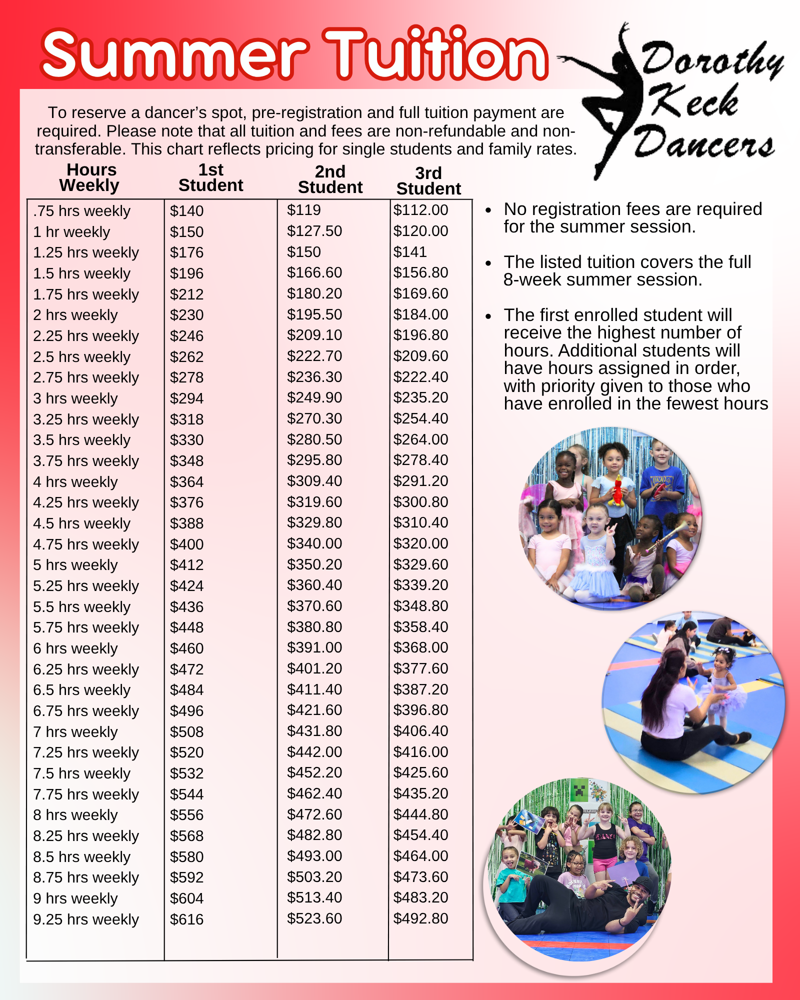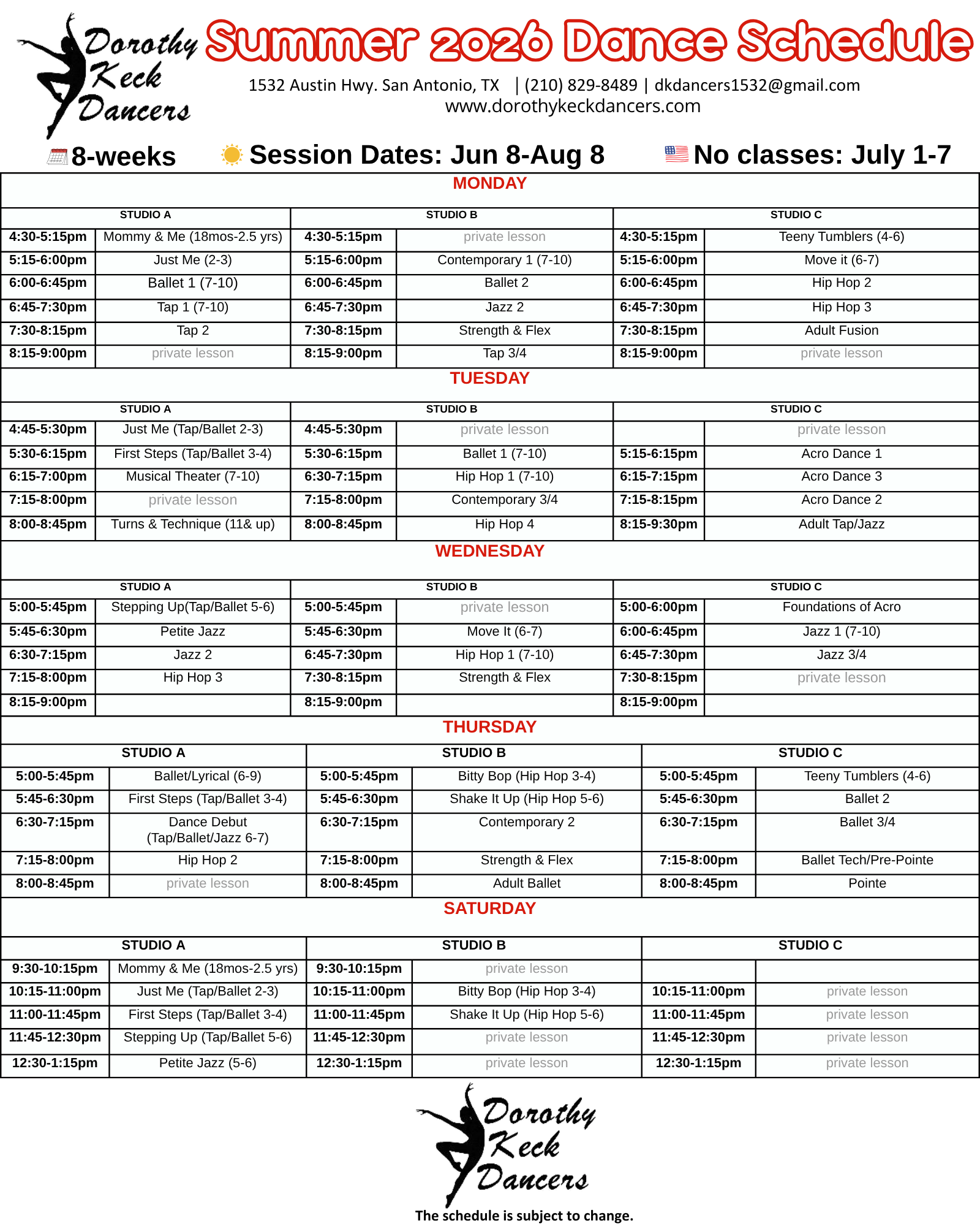 This is our 9th year at Dorothy Keck Dancers, and it has been phenomenal! My daughter has grown into such a beautiful dancer in many dance genres and has had opportunities to showcase her skills and even compete in them. The instructors are the best! All the students and parents are very friendly and inclusive, making it a fun place for me to go to. I highly recommend DKD. Call Ms. Stephanie, the owner, and she and her team will find the right classes for your dancer and watch them thrive!